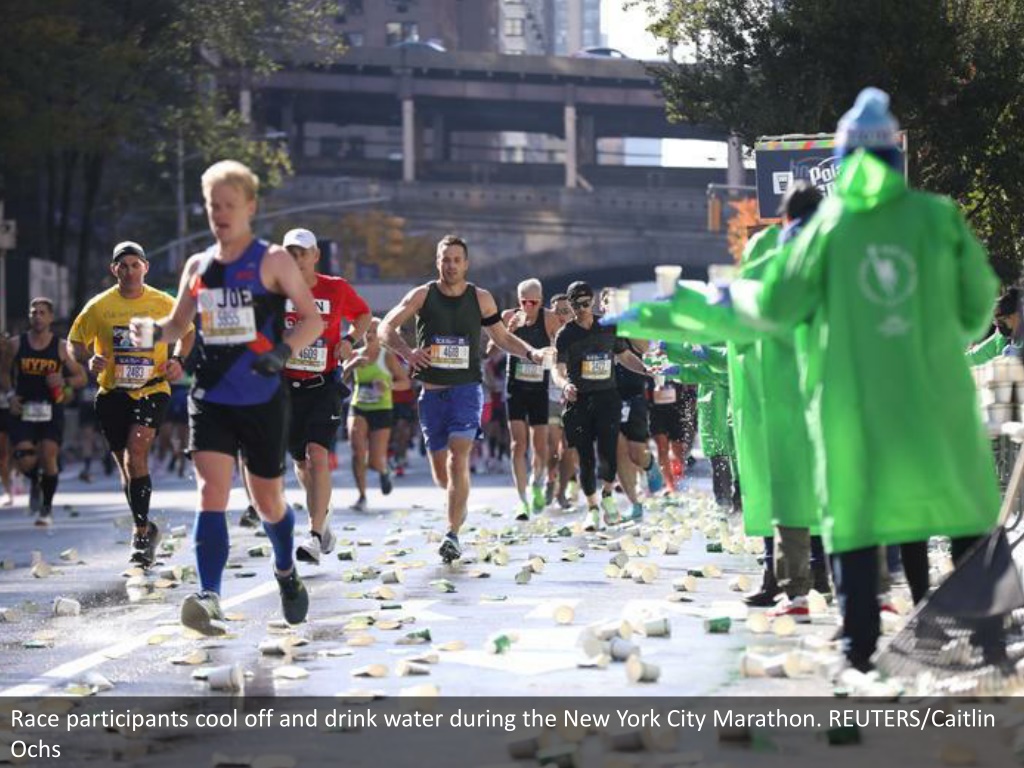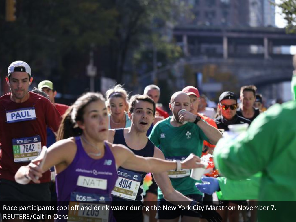 Race participants cool off and drink water during the New York City Marathon. REUTERS/Caitlin Ochs