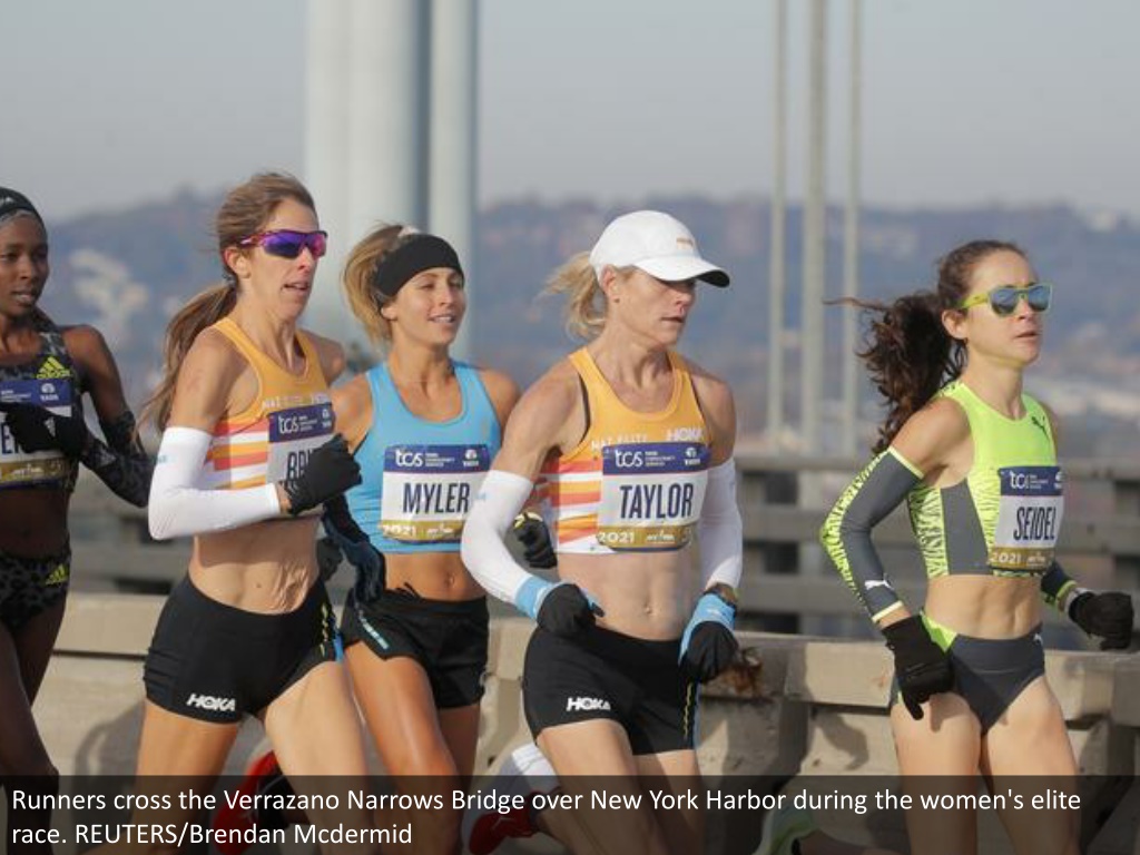 Runners cross the Verrazano Narrows Bridge over New York Harbor during the women's elite race. REUTERS/Brendan Mcdermid