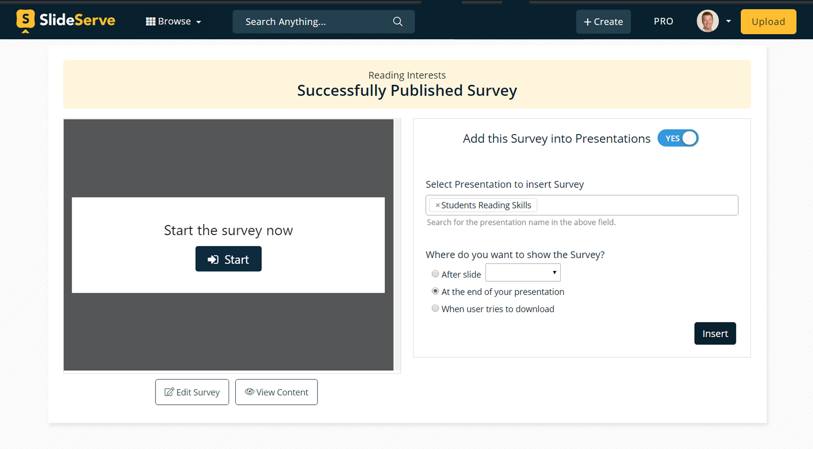 Survey placement is a major factor which improves user engagement. There are 4 options to place your survey in SlideServe: