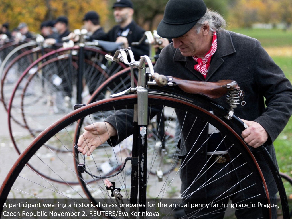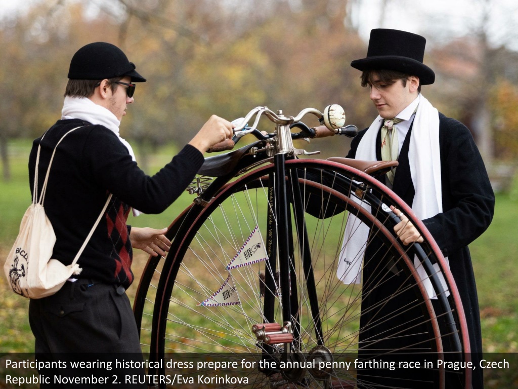 Participants wearing historical dress prepare for the annual penny farthing race in Prague, Czech Republic November 2. REUTERS/Eva Korinkova