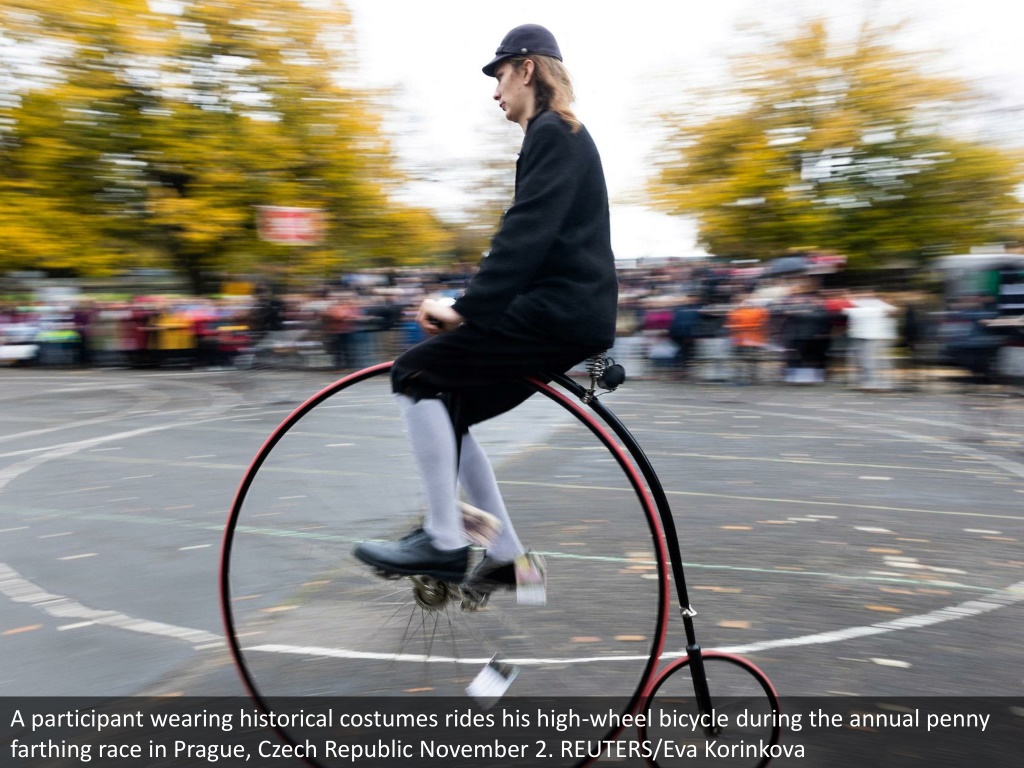 A participant wearing historical costumes rides his high-wheel bicycle during the annual penny farthing race in Prague, Czech Republic November 2. REUTERS/Eva Korinkova