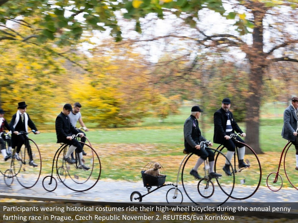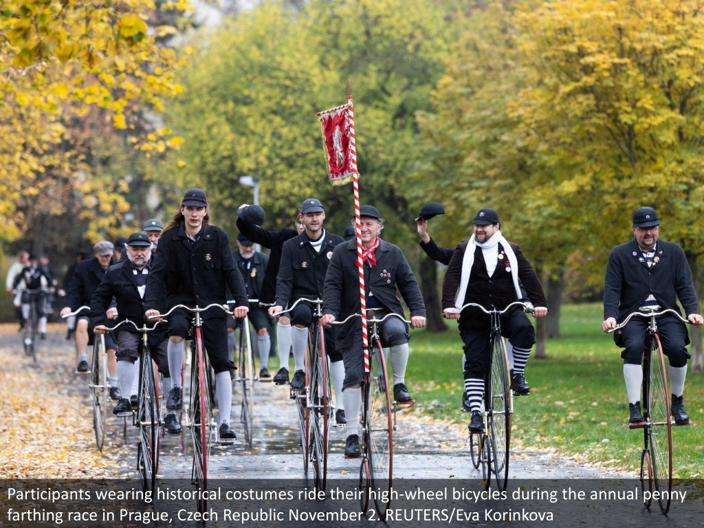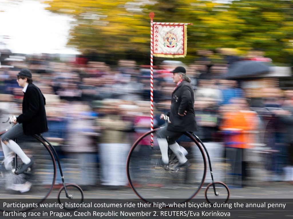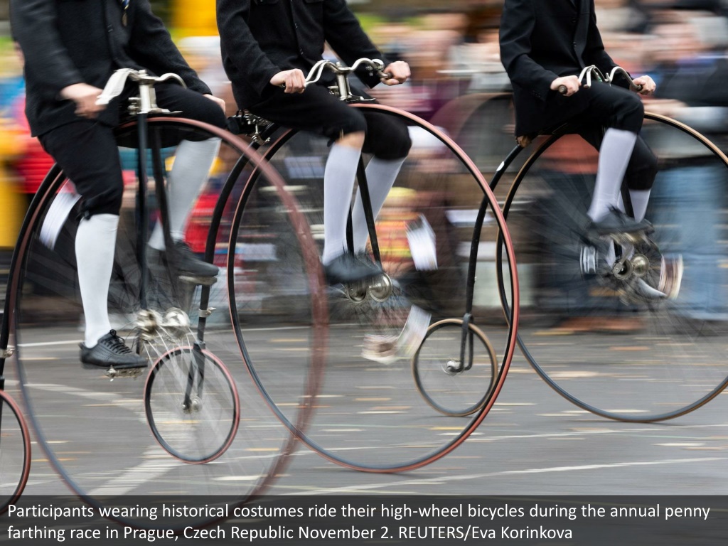 Participants wearing historical costumes ride their high-wheel bicycles during the annual penny farthing race in Prague, Czech Republic November 2. REUTERS/Eva Korinkova