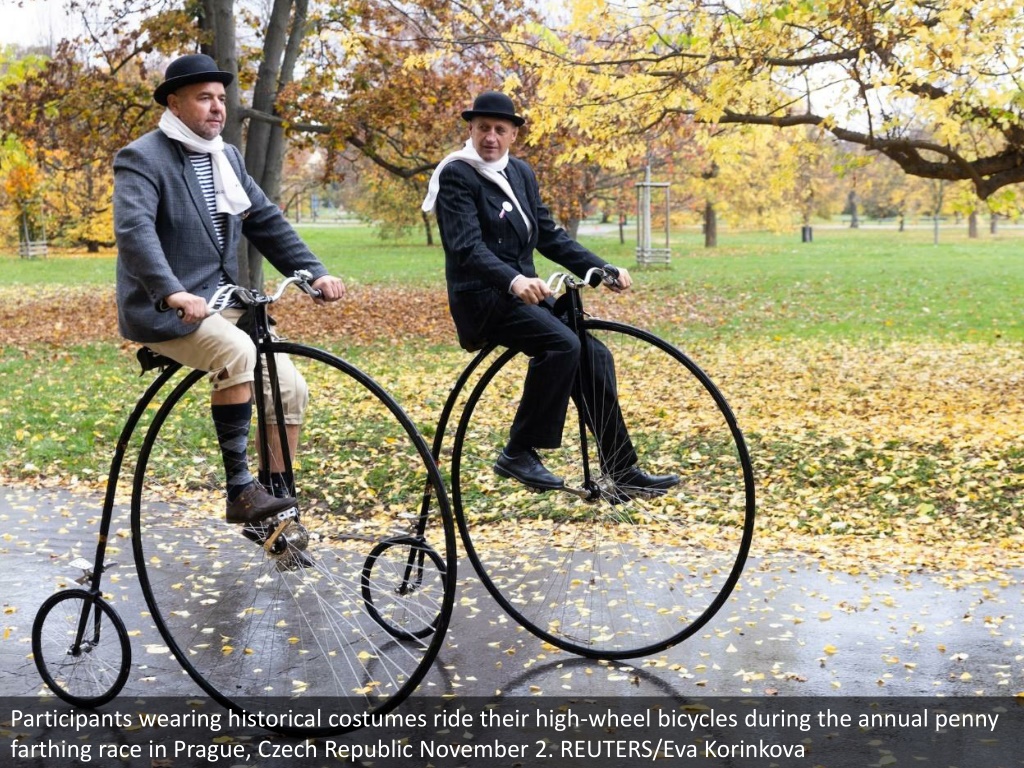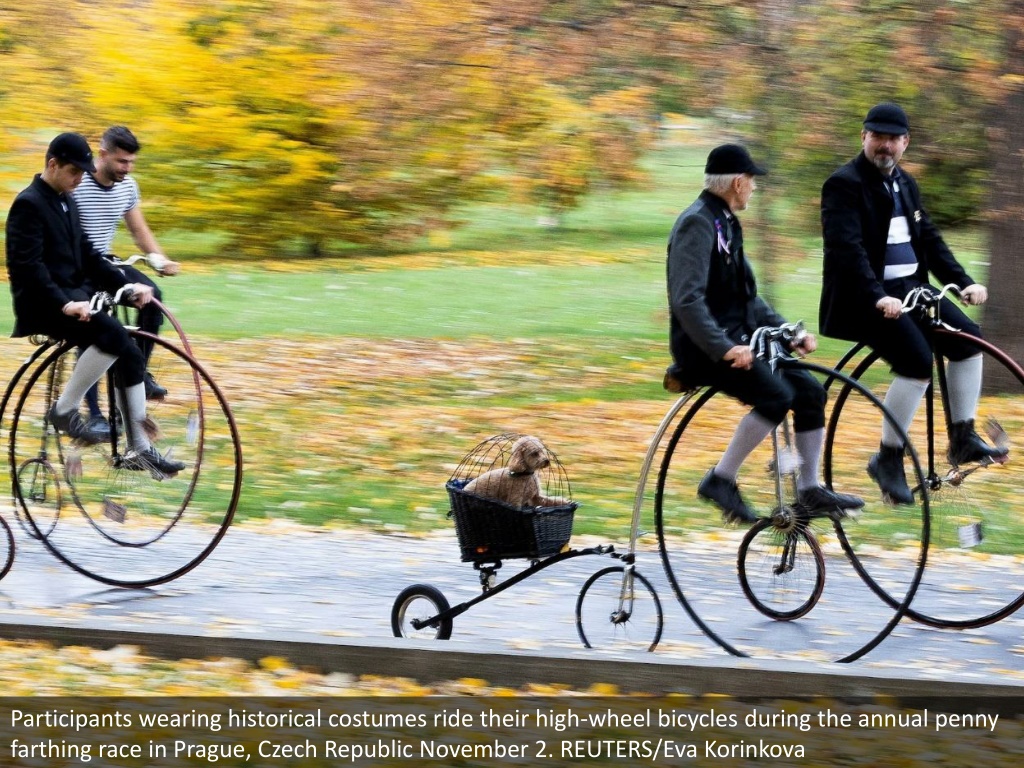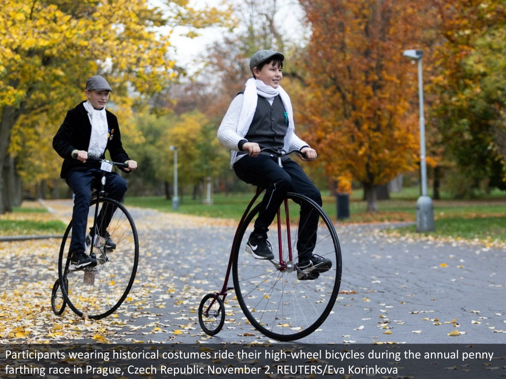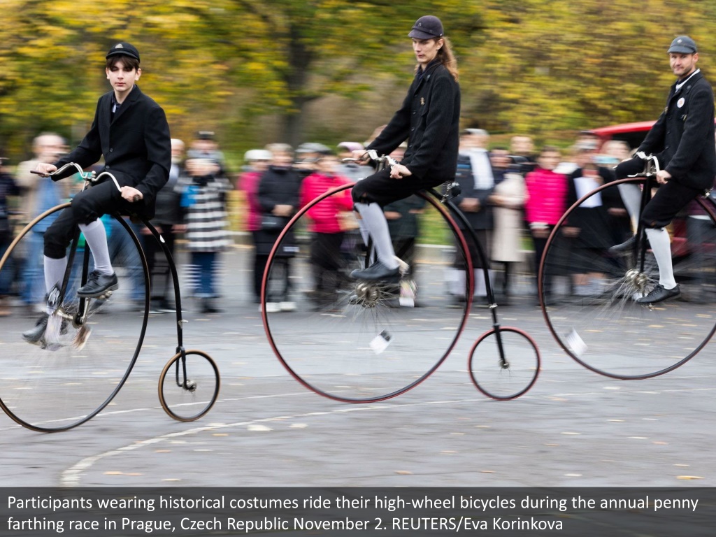 Participants wearing historical costumes ride their high-wheel bicycles during the annual penny farthing race in Prague, Czech Republic November 2. REUTERS/Eva Korinkova