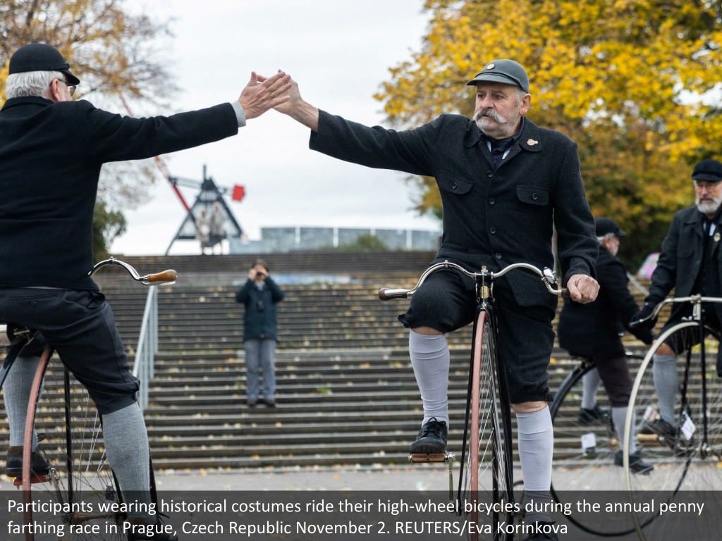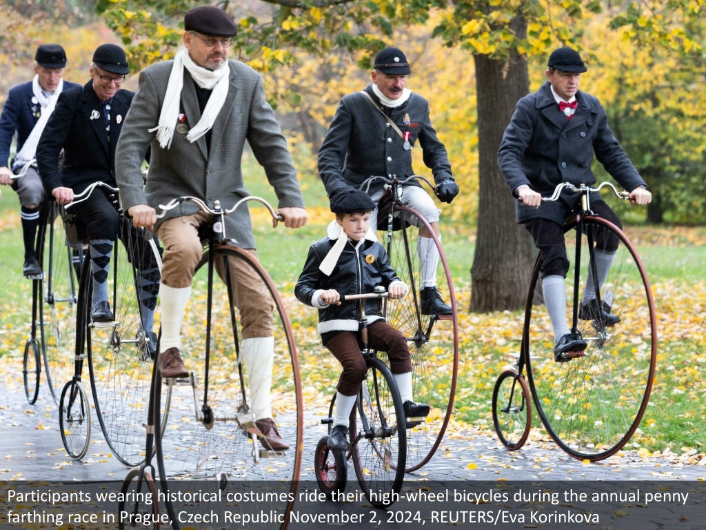 Participants wearing historical costumes ride their high-wheel bicycles during the annual penny farthing race in Prague, Czech Republic November 2, 2024, REUTERS/Eva Korinkova