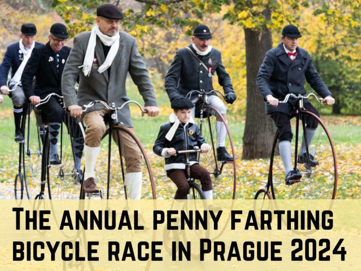 Participants in historical costumes ride high-wheel bicycles in the annual penny farthing race in Prague, Czech Republic.