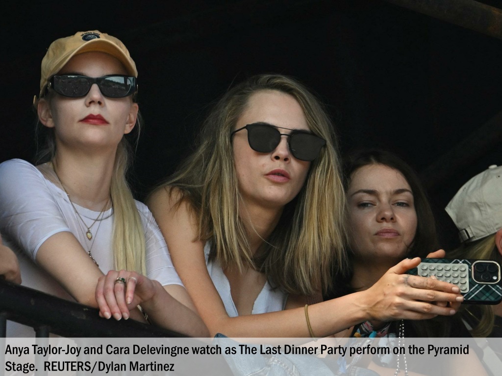 Anya Taylor-Joy and Cara Delevingne watch as The Last Dinner Party perform on the Pyramid Stage. REUTERS/Dylan Martinez