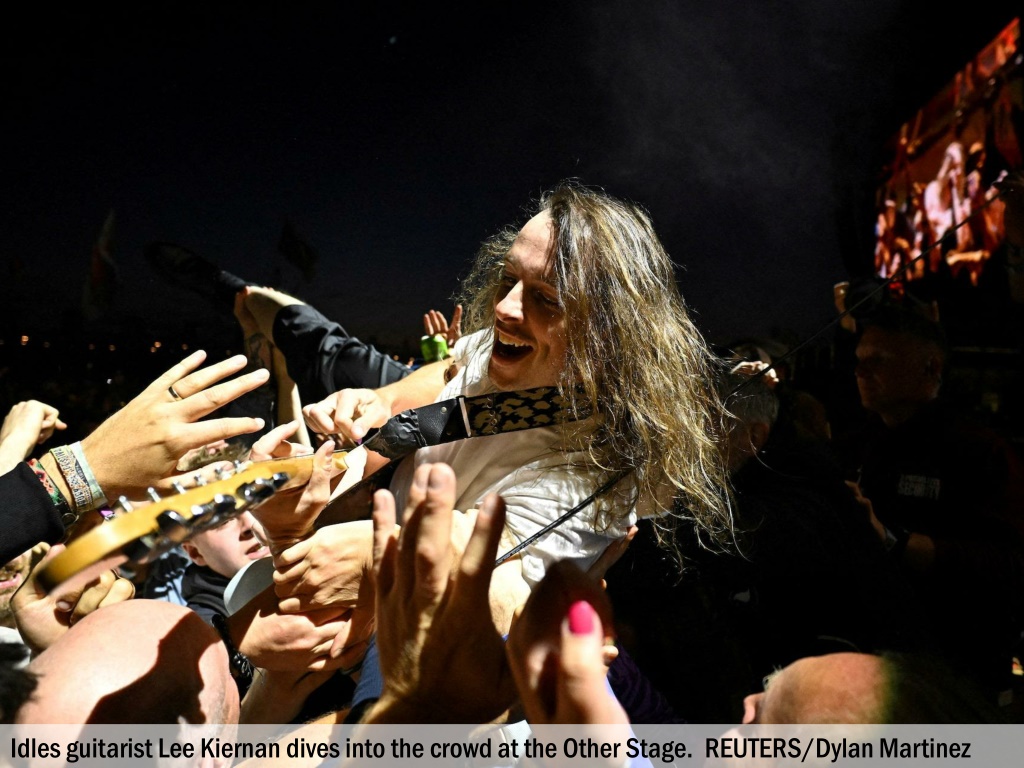 Idles guitarist Lee Kiernan dives into the crowd at the Other Stage. REUTERS/Dylan Martinez