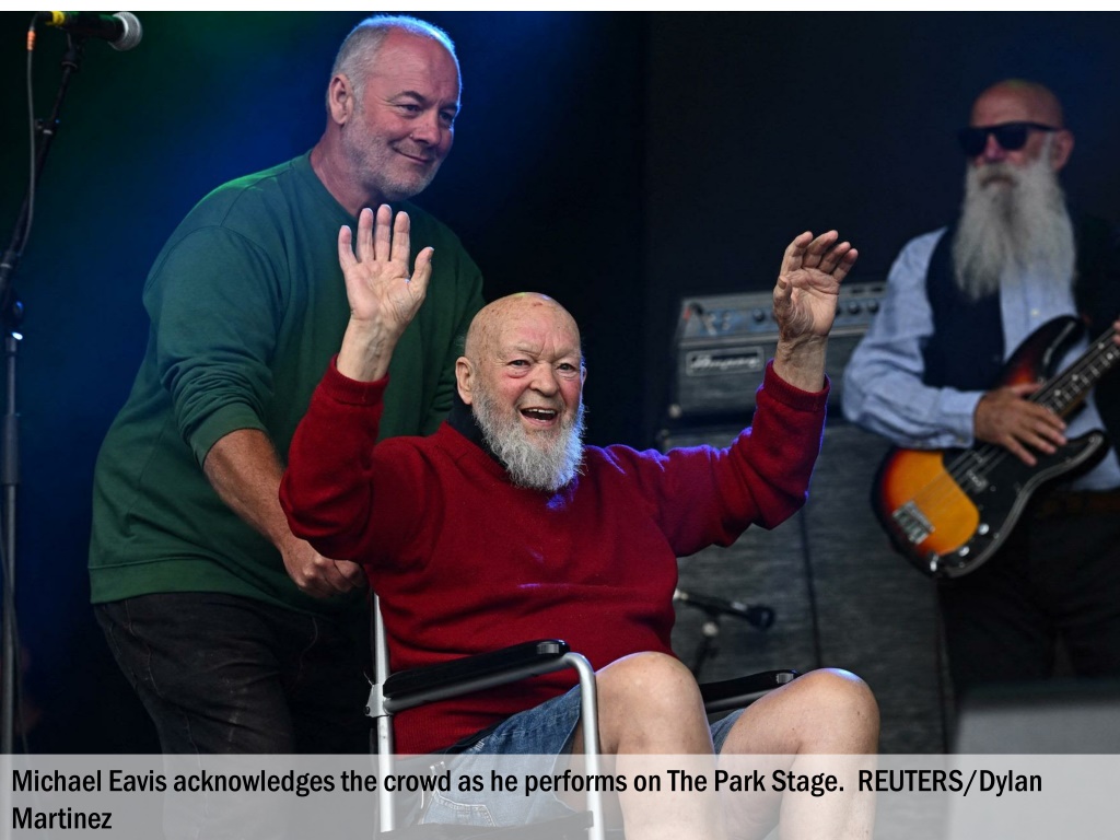Michael Eavis acknowledges the crowd as he performs on The Park Stage. REUTERS/Dylan Martinez