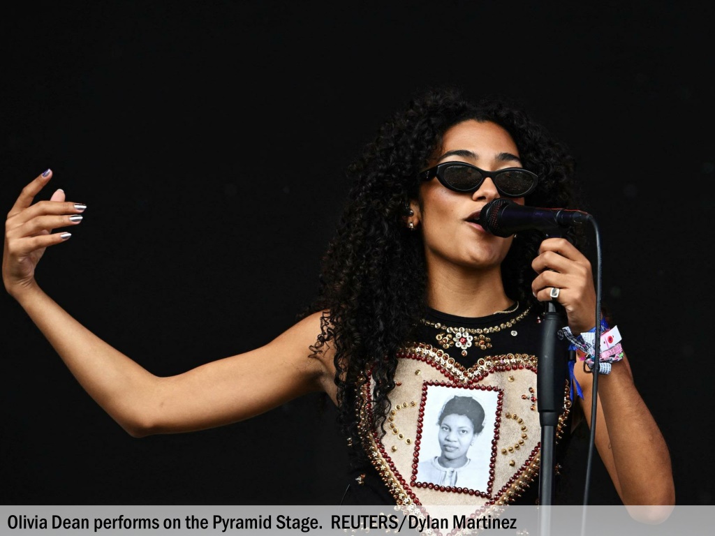 Olivia Dean performs on the Pyramid Stage. REUTERS/Dylan Martinez