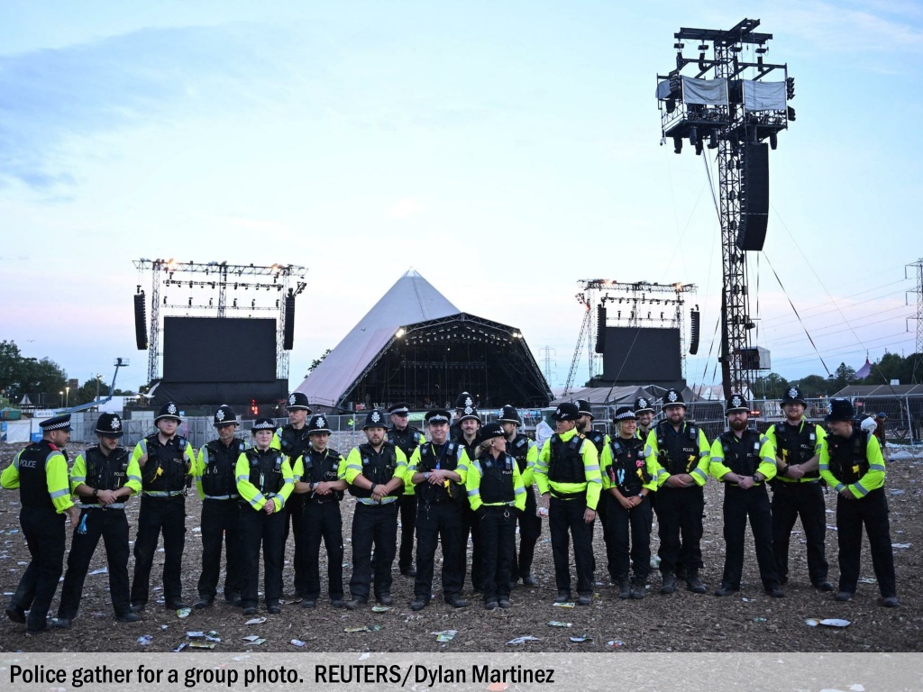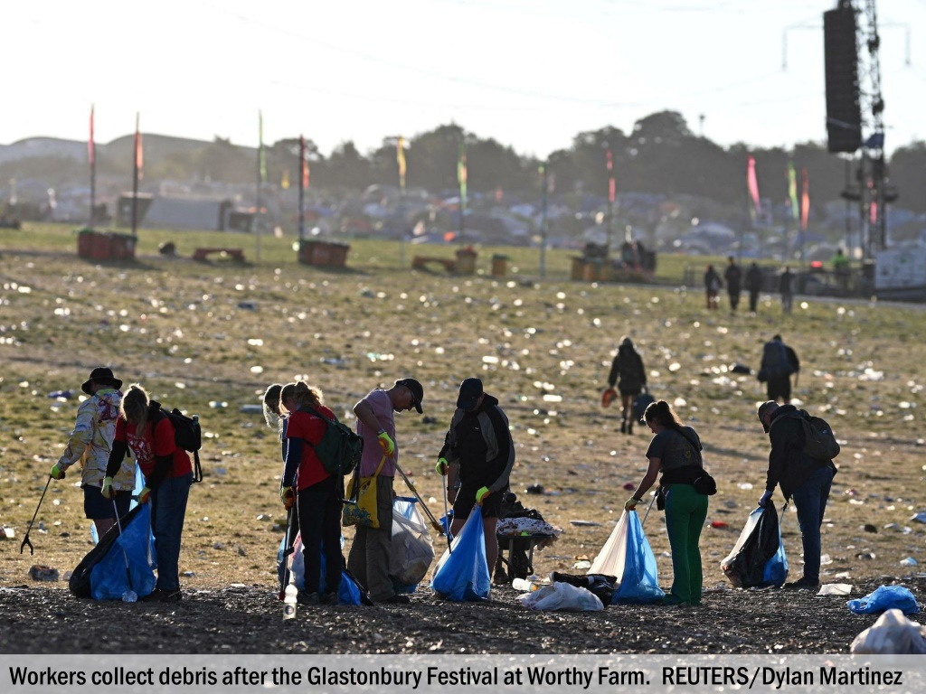 Workers collect debris after the Glastonbury Festival at Worthy Farm. REUTERS/Dylan Martinez