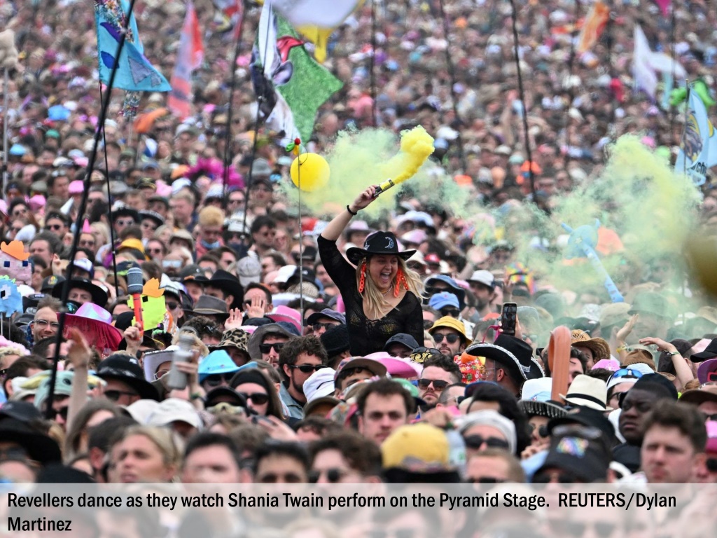 Revellers dance as they watch Shania Twain perform on the Pyramid Stage. REUTERS/Dylan Martinez