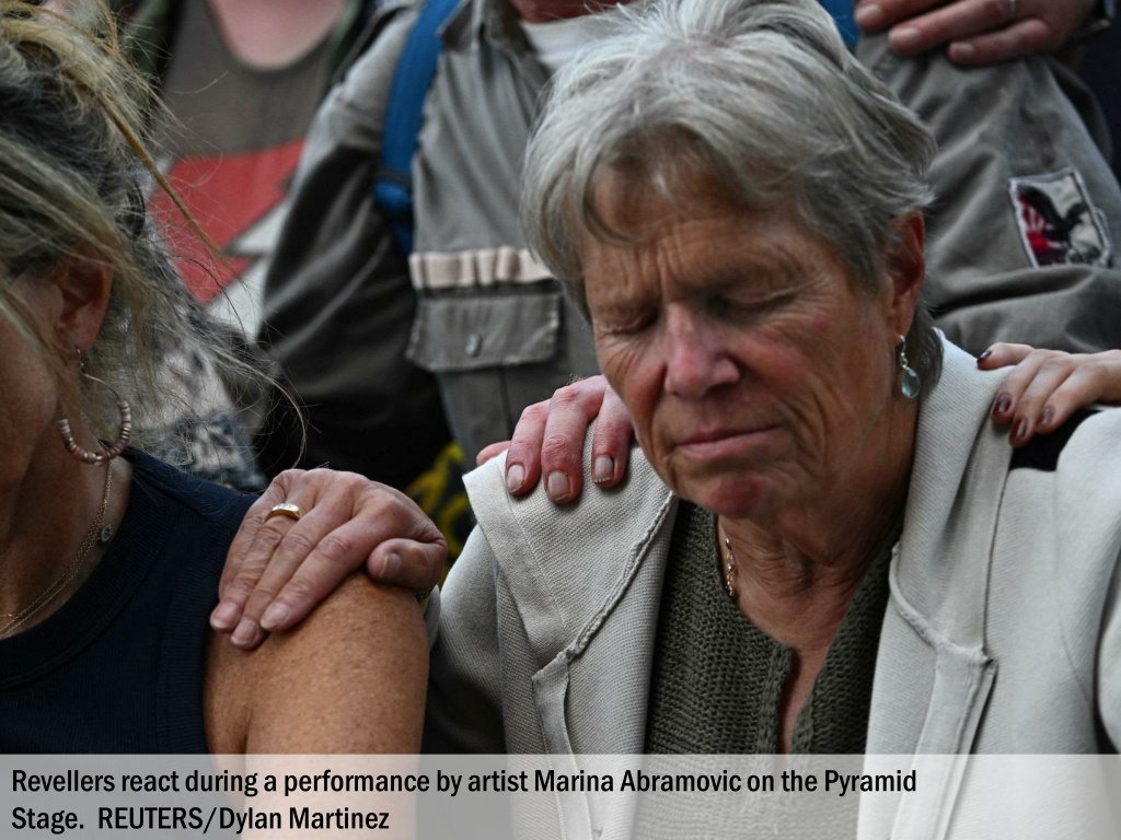 Revellers react during a performance by artist Marina Abramovic on the Pyramid Stage. REUTERS/Dylan Martinez