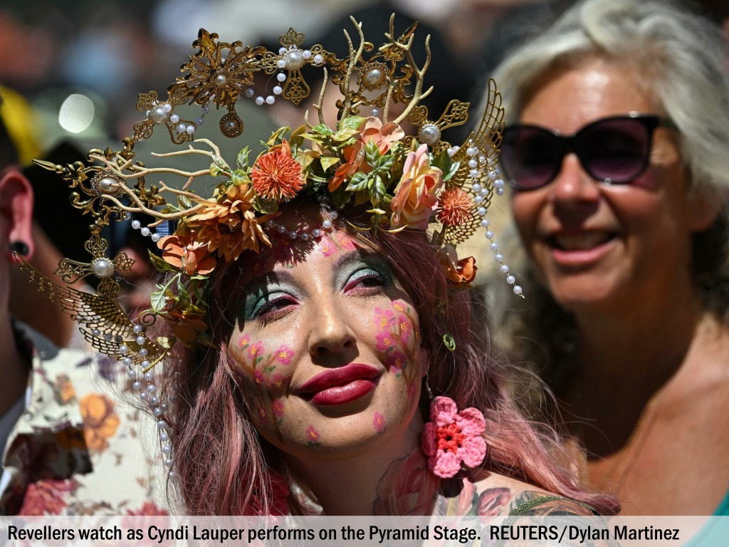Revellers watch as Cyndi Lauper performs on the Pyramid Stage. REUTERS/Dylan Martinez