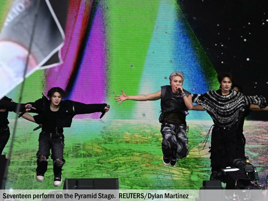 Seventeen perform on the Pyramid Stage. REUTERS/Dylan Martinez
