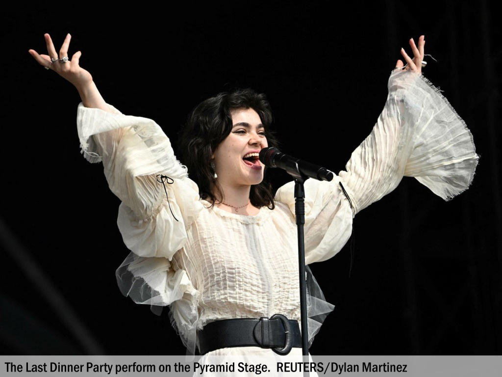 The Last Dinner Party perform on the Pyramid Stage. REUTERS/Dylan Martinez