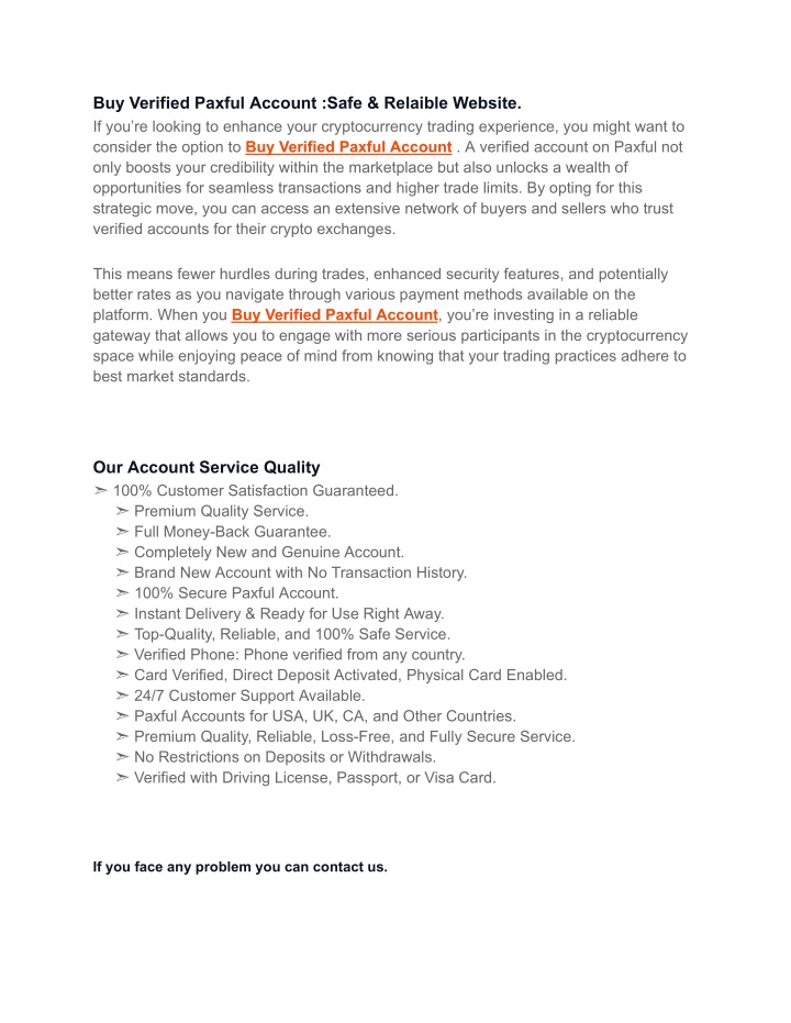 If youu2019re looking to enhance your cryptocurrency trading experience, you might want to consider the option to Buy Verified Paxful Account . A verified account on Paxful not only boosts your credibility within the marketplace but also unlocks a wealth of opportunities for seamless transactions and higher trade limits. By opting for this strategic move, you can access an extensive network of buyers and sellers who trust verified accounts for their crypto exchanges.<br>If you face any problem you can contact us.<br> Email: usapvareviewoffical@gmail.com<br> Skype: UsaPVA Review<br> Telegram: @usapvarevi