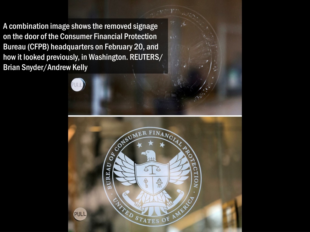 A combination image shows the removed signage on the door of the Consumer Financial Protection Bureau (CFPB) headquarters on February 20, and how it looked previously, in Washington. REUTERS/ Brian Snyder/Andrew Kelly