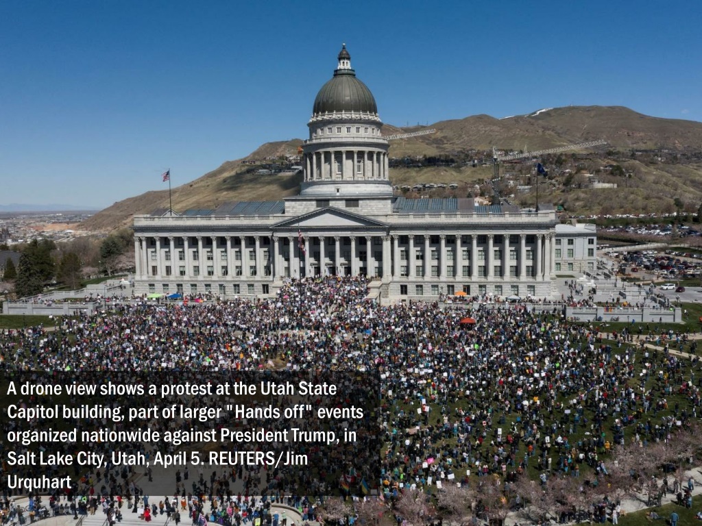A drone view shows a protest at the Utah State Capitol building, part of larger "Hands off" events organized nationwide against President Trump, in Salt Lake City, Utah, April 5. REUTERS/Jim Urquhart