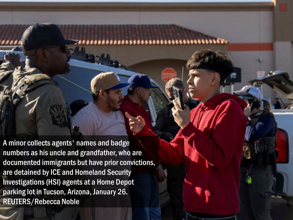A minor collects agents' names and badge numbers as his uncle and grandfather, who are documented immigrants but have prior convictions, are detained by ICE and Homeland Security Investigations (HSI) agents at a Home Depot parking lot in Tucson, Arizona, January 26. REUTERS/Rebecca Noble