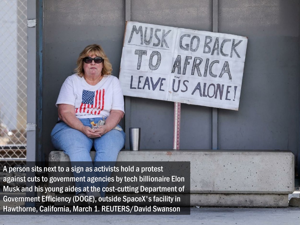 A person sits next to a sign as activists hold a protest against cuts to government agencies by tech billionaire Elon Musk and his young aides at the cost-cutting Department of Government Efficiency (DOGE), outside SpaceX's facility in Hawthorne, California, March 1. REUTERS/David Swanson