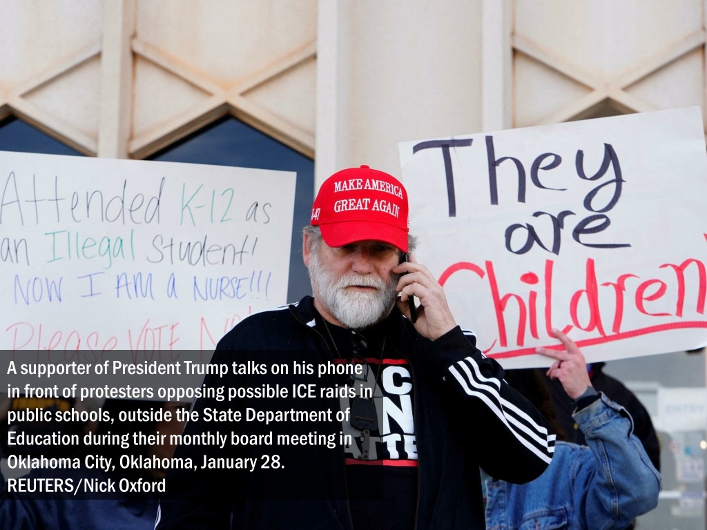 A supporter of President Trump talks on his phone in front of protesters opposing possible ICE raids in public schools, outside the State Department of Education during their monthly board meeting in Oklahoma City, Oklahoma, January 28. REUTERS/Nick Oxford
