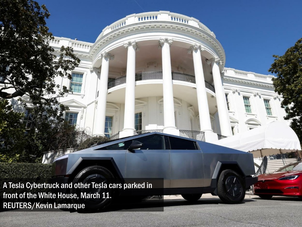A Tesla Cybertruck and other Tesla cars parked in front of the White House, March 11. REUTERS/Kevin Lamarque