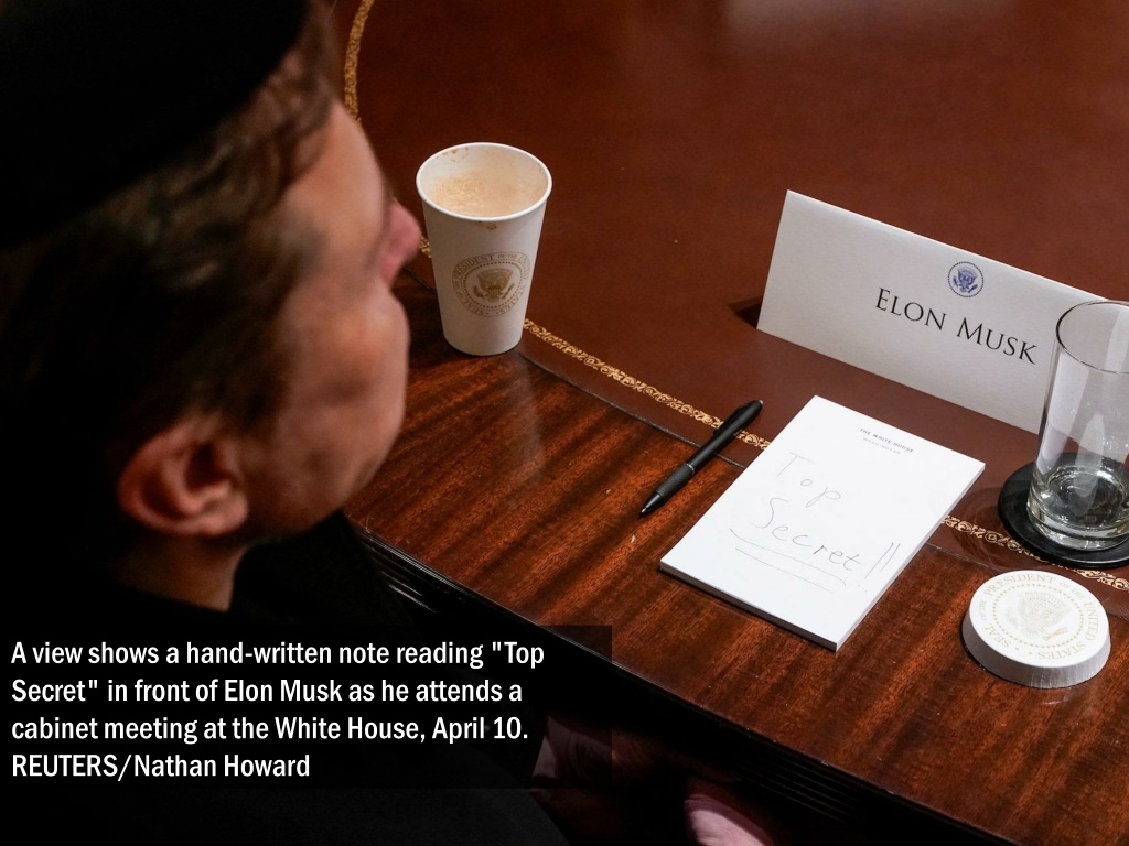 A view shows a hand-written note reading "Top Secret" in front of Elon Musk as he attends a cabinet meeting at the White House, April 10. REUTERS/Nathan Howard