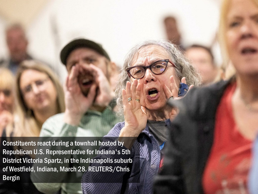 Constituents react during a townhall hosted by Republican U.S. Representative for Indiana's 5th District Victoria Spartz, in the Indianapolis suburb of Westfield, Indiana, March 28. REUTERS/Chris Bergin