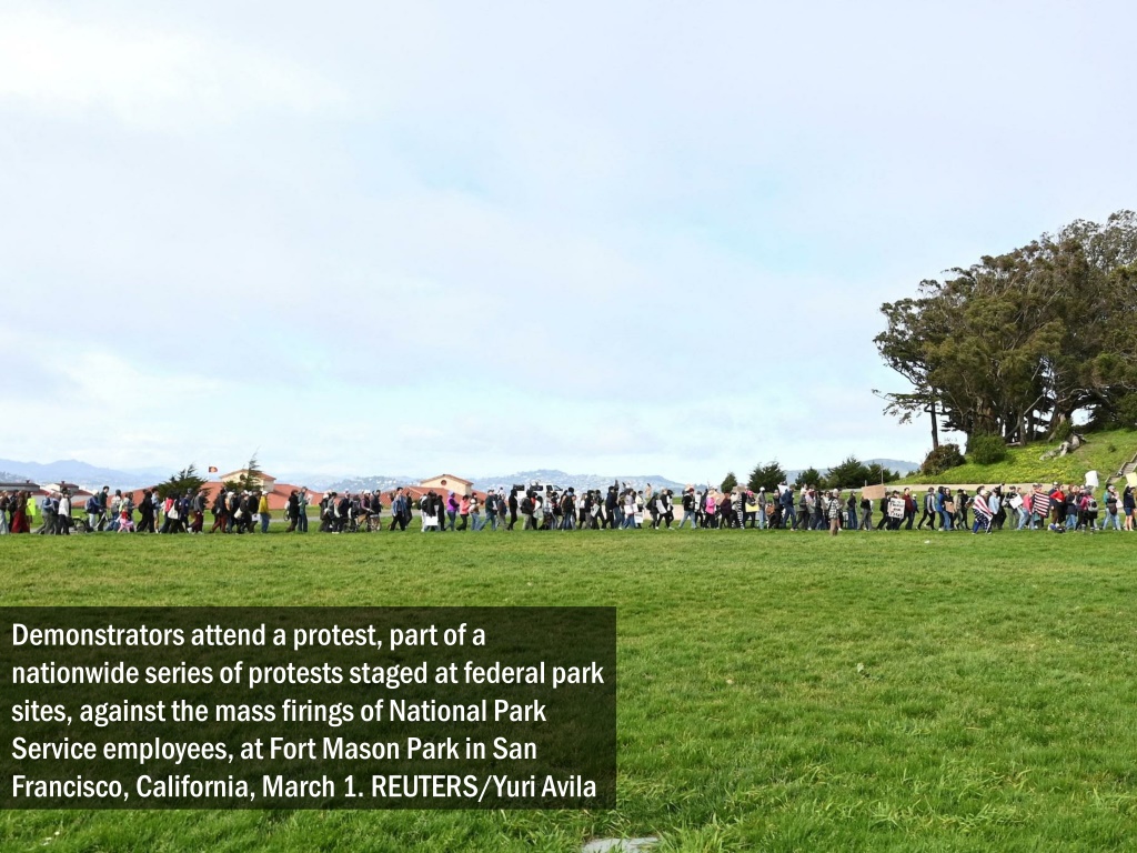 Demonstrators attend a protest, part of a nationwide series of protests staged at federal park sites, against the mass firings of National Park Service employees, at Fort Mason Park in San Francisco, California, March 1. REUTERS/Yuri Avila