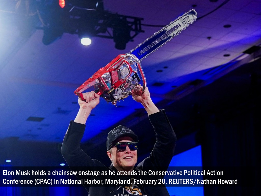 Elon Musk holds a chainsaw onstage as he attends the Conservative Political Action Conference (CPAC) in National Harbor, Maryland, February 20. REUTERS/Nathan Howard