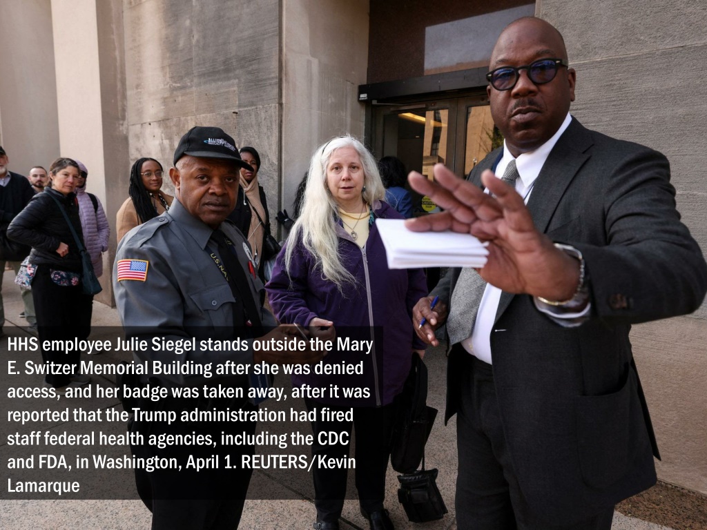 HHS employee Julie Siegel stands outside the Mary E. Switzer Memorial Building after she was denied access, and her badge was taken away, after it was reported that the Trump administration had fired staff federal health agencies, including the CDC and FDA, in Washington, April 1. REUTERS/Kevin Lamarque