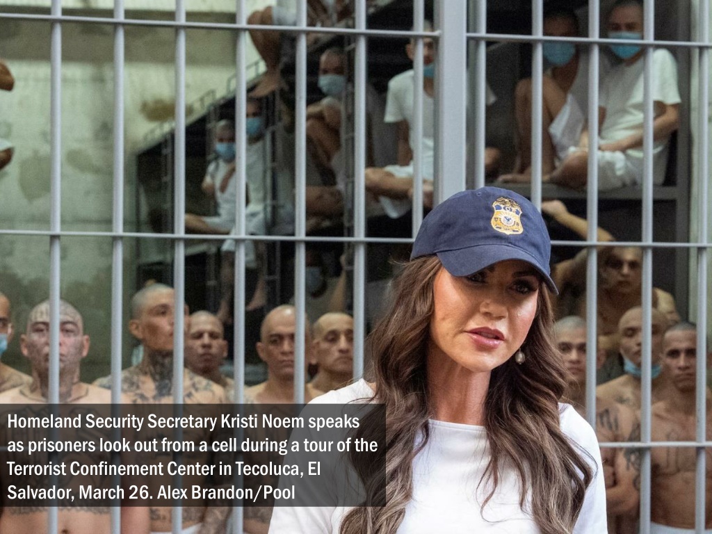 Homeland Security Secretary Kristi Noem speaks as prisoners look out from a cell during a tour of the Terrorist Confinement Center in Tecoluca, El Salvador, March 26. Alex Brandon/Pool