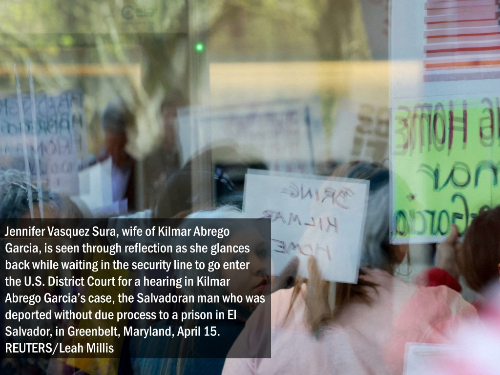 Jennifer Vasquez Sura, wife of KilmarAbrego Garcia, is seen through reflection as she glances back while waiting in the security line to go enter the U.S. District Court for a hearing in KilmarAbrego Garcia’s case, the Salvadoran man who was deported without due process to a prison in El Salvador, in Greenbelt, Maryland, April 15. REUTERS/Leah Millis