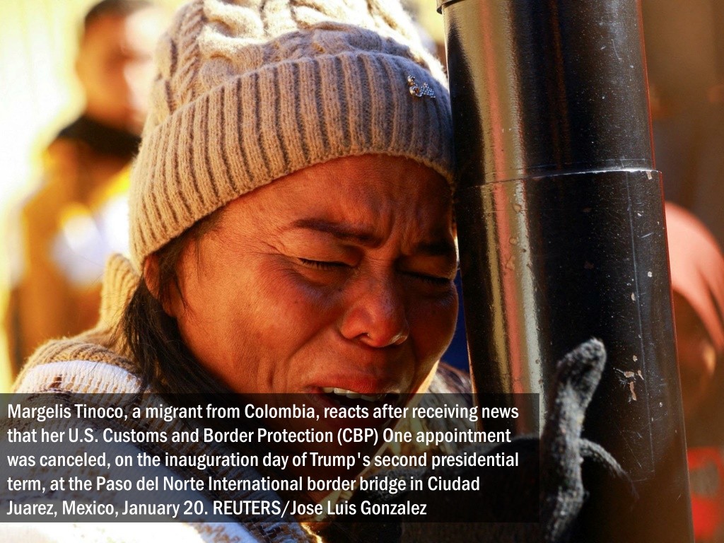 Margelis Tinoco, a migrant from Colombia, reacts after receiving news that her U.S. Customs and Border Protection (CBP) One appointment was canceled, on the inauguration day of Trump's second presidential term, at the Paso del Norte International border bridge in Ciudad Juarez, Mexico, January 20. REUTERS/Jose Luis Gonzalez