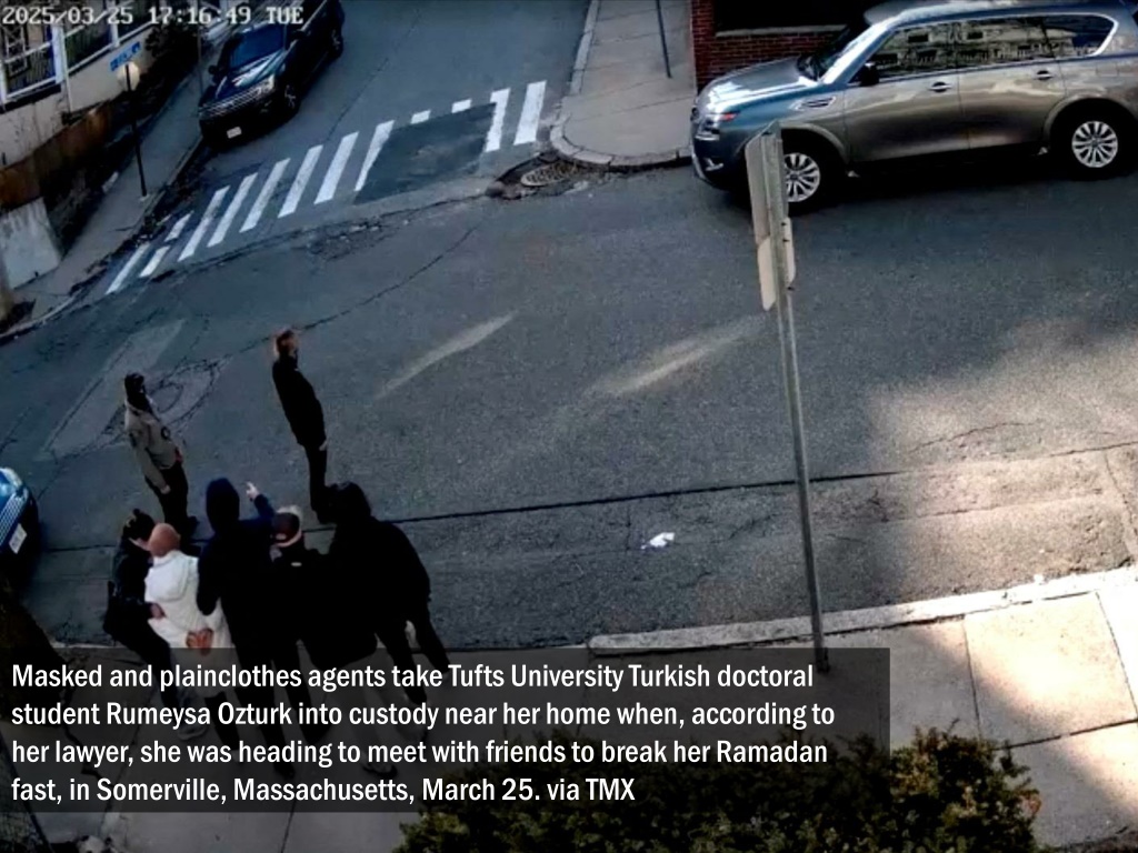 Masked and plainclothes agents take Tufts University Turkish doctoral student Rumeysa Ozturk into custody near her home when, according to her lawyer, she was heading to meet with friends to break her Ramadan fast, in Somerville, Massachusetts, March 25. via TMX