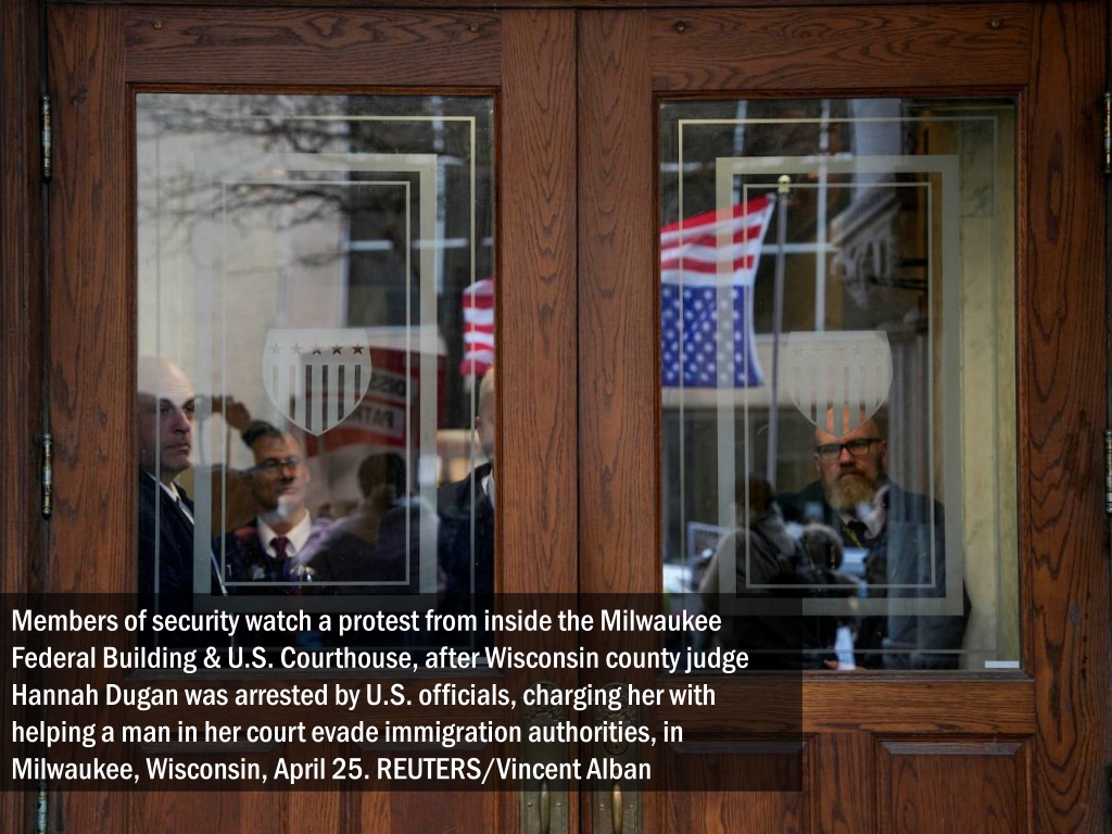 Members of security watch a protest from inside the Milwaukee Federal Building & U.S. Courthouse, after Wisconsin county judge Hannah Dugan was arrested by U.S. officials, charging her with helping a man in her court evade immigration authorities, in Milwaukee, Wisconsin, April 25. REUTERS/Vincent Alban