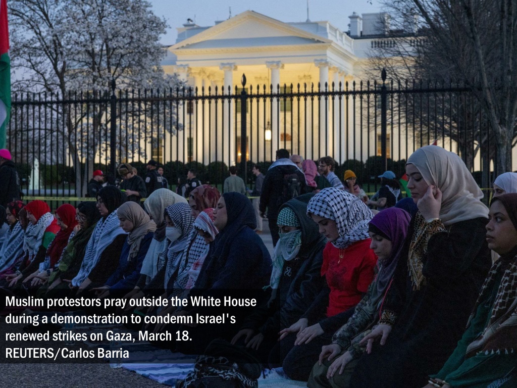 Muslim protestors pray outside the White House during a demonstration to condemn Israel's renewed strikes on Gaza, March 18. REUTERS/Carlos Barria
