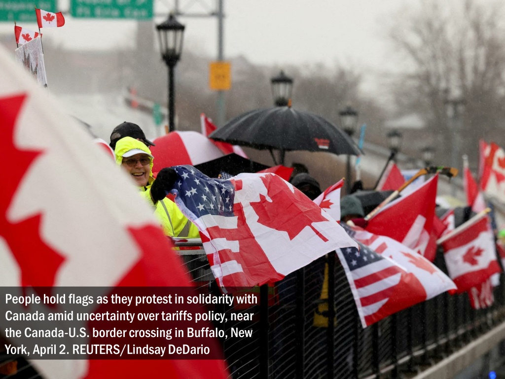 People hold flags as they protest in solidarity with Canada amid uncertainty over tariffs policy, near the Canada-U.S. border crossing in Buffalo, New York, April 2. REUTERS/Lindsay DeDario