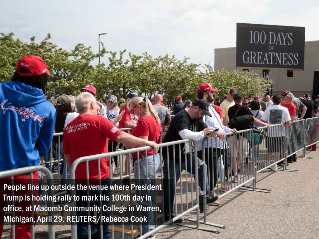 People line up outside the venue where President Trump is holding rally to mark his 100th day in office, at Macomb Community College in Warren, Michigan, April 29. REUTERS/Rebecca Cook