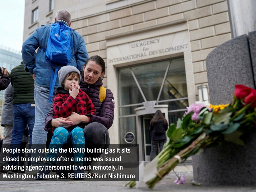 People stand outside the USAID building as it sits closed to employees after a memo was issued advising agency personnel to work remotely, in Washington, February 3. REUTERS/Kent Nishimura