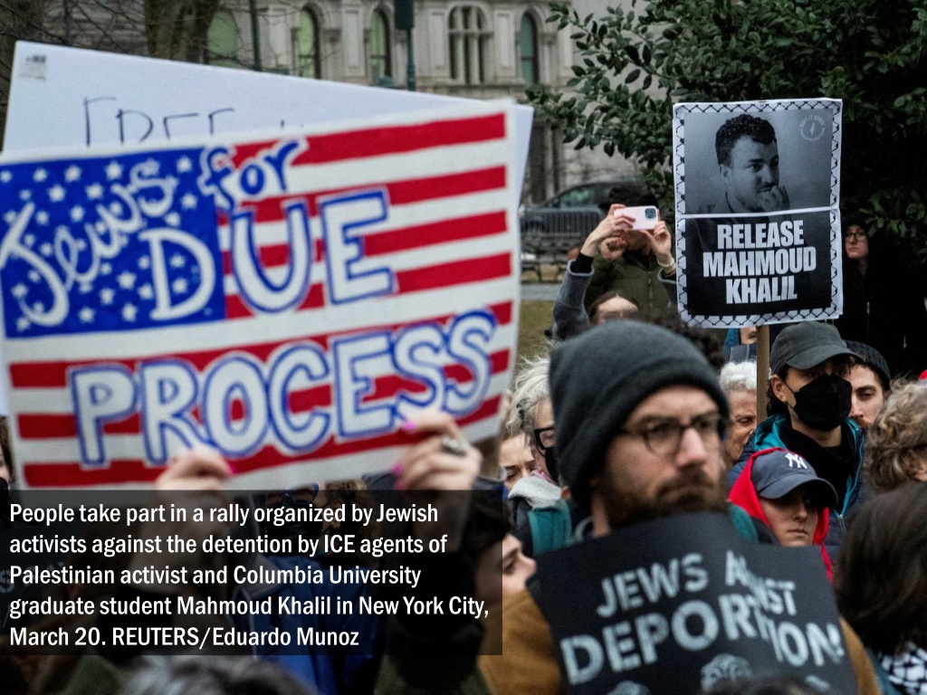 People take part in a rally organized by Jewish activists against the detention by ICE agents of Palestinian activist and Columbia University graduate student Mahmoud Khalil in New York City, March 20. REUTERS/Eduardo Munoz
