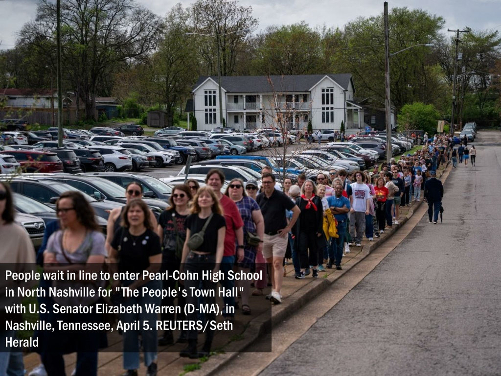 People wait in line to enter Pearl-Cohn High School in North Nashville for "The People's Town Hall" with U.S. Senator Elizabeth Warren (D-MA), in Nashville, Tennessee, April 5. REUTERS/Seth Herald