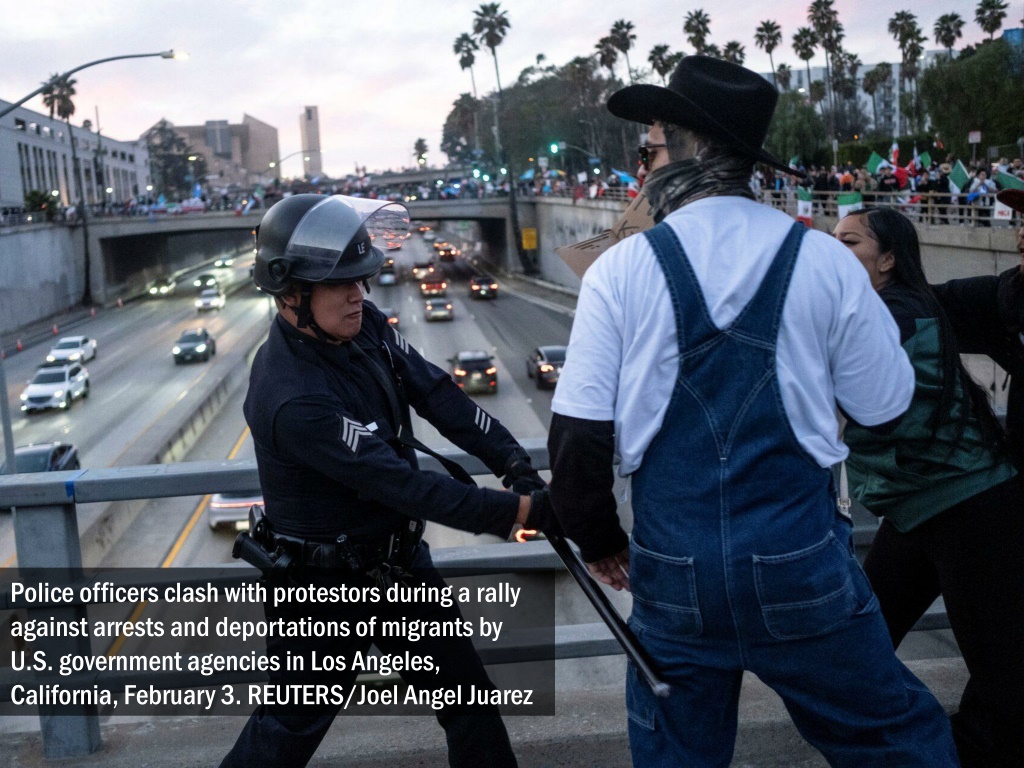 Police officers clash with protestors during a rally against arrests and deportations of migrants by U.S. government agencies in Los Angeles, California, February 3. REUTERS/Joel Angel Juarez