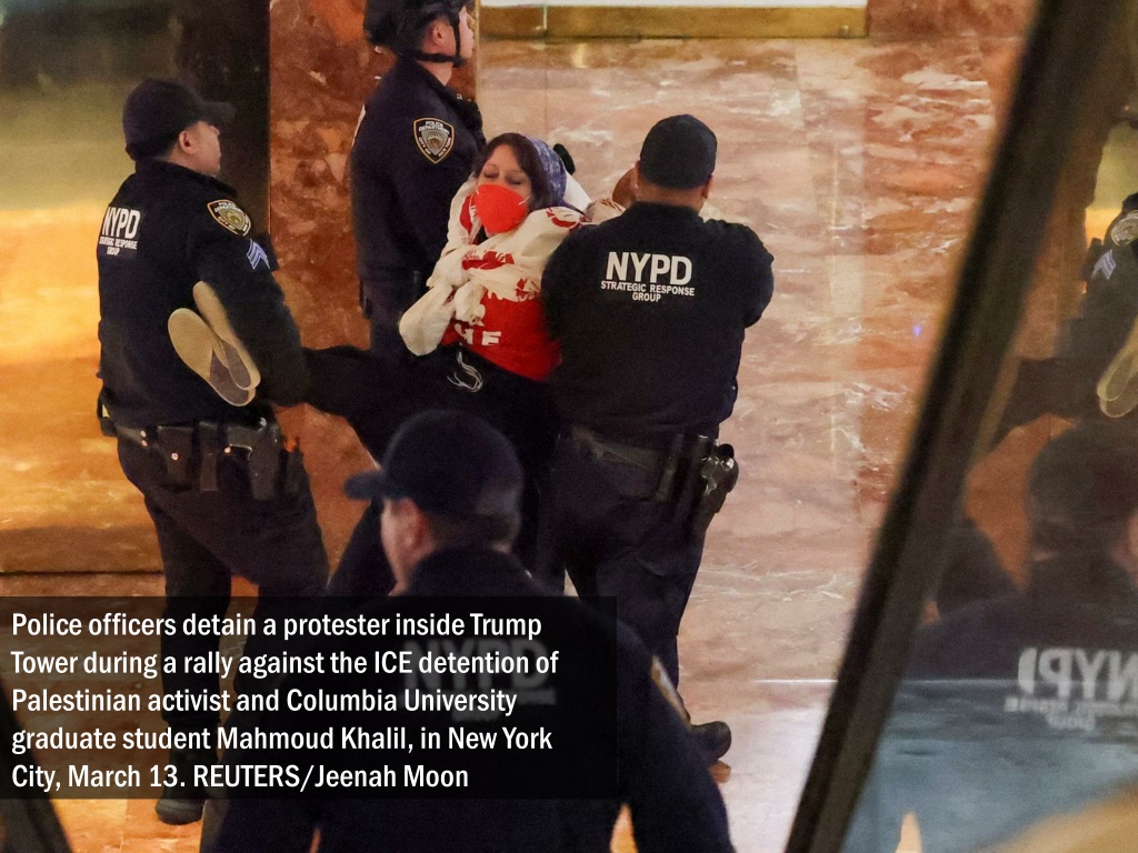 Police officers detain a protester inside Trump Tower during a rally against the ICE detention of Palestinian activist and Columbia University graduate student Mahmoud Khalil, in New York City, March 13. REUTERS/Jeenah Moon