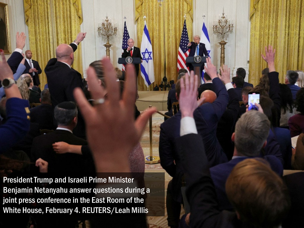 President Trump and Israeli Prime Minister Benjamin Netanyahu answer questions during a joint press conference in the East Room of the White House, February 4. REUTERS/Leah Millis