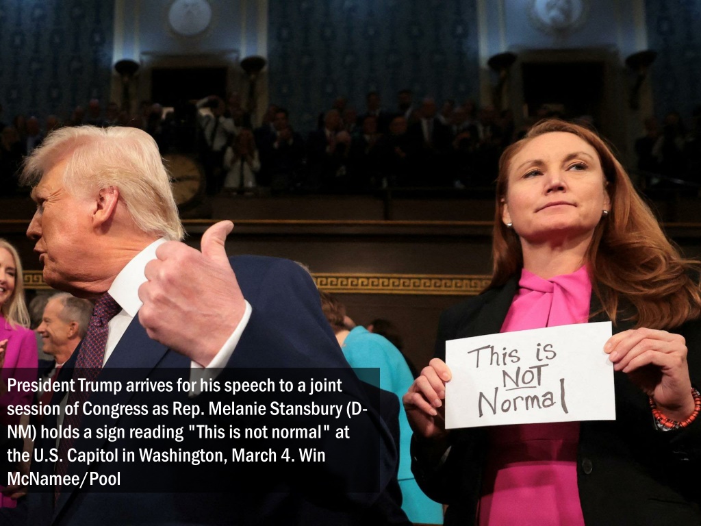 President Trump arrives for his speech to a joint session of Congress as Rep. Melanie Stansbury (D-NM) holds a sign reading "This is not normal" at the U.S. Capitol in Washington, March 4. Win McNamee/Pool
