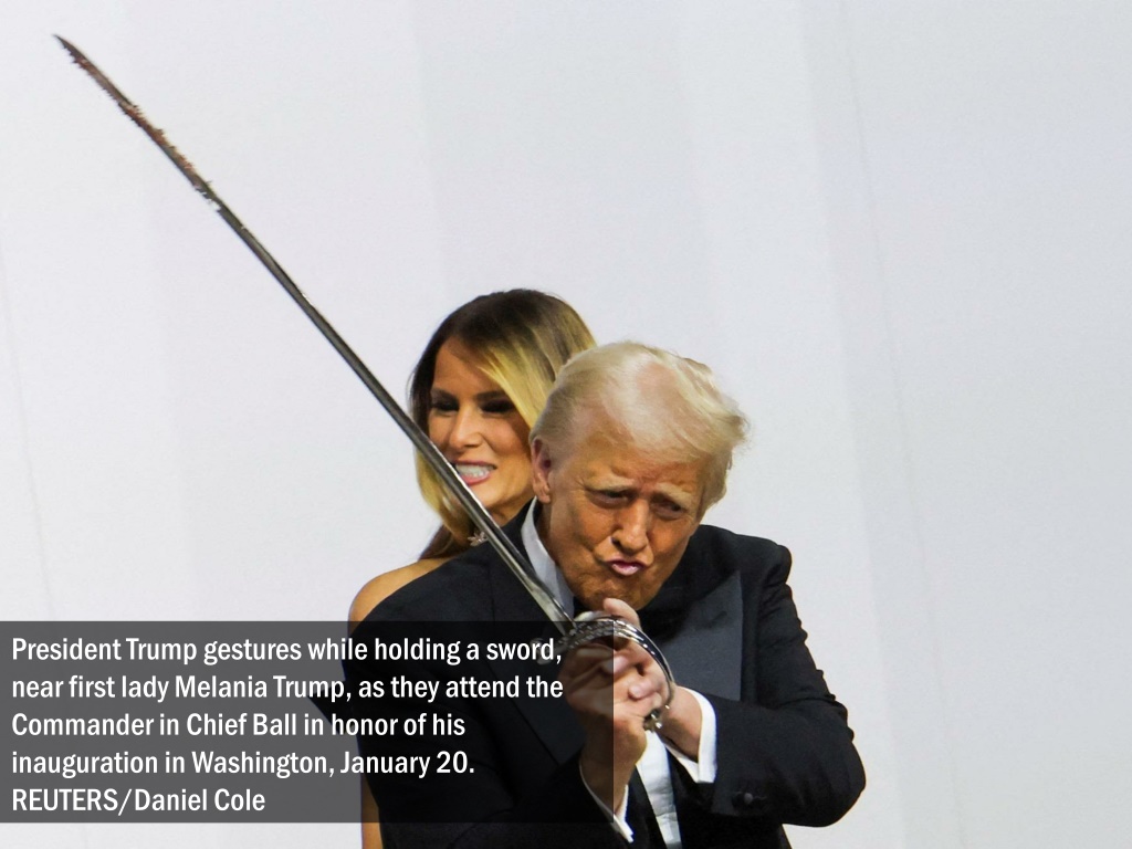 President Trump gestures while holding a sword, near first lady Melania Trump, as they attend the Commander in Chief Ball in honor of his inauguration in Washington, January 20. REUTERS/Daniel Cole