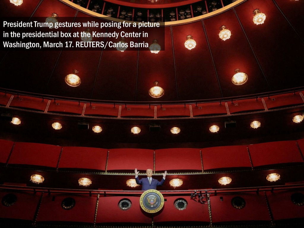 President Trump gestures while posing for a picture in the presidential box at the Kennedy Center in Washington, March 17. REUTERS/Carlos Barria