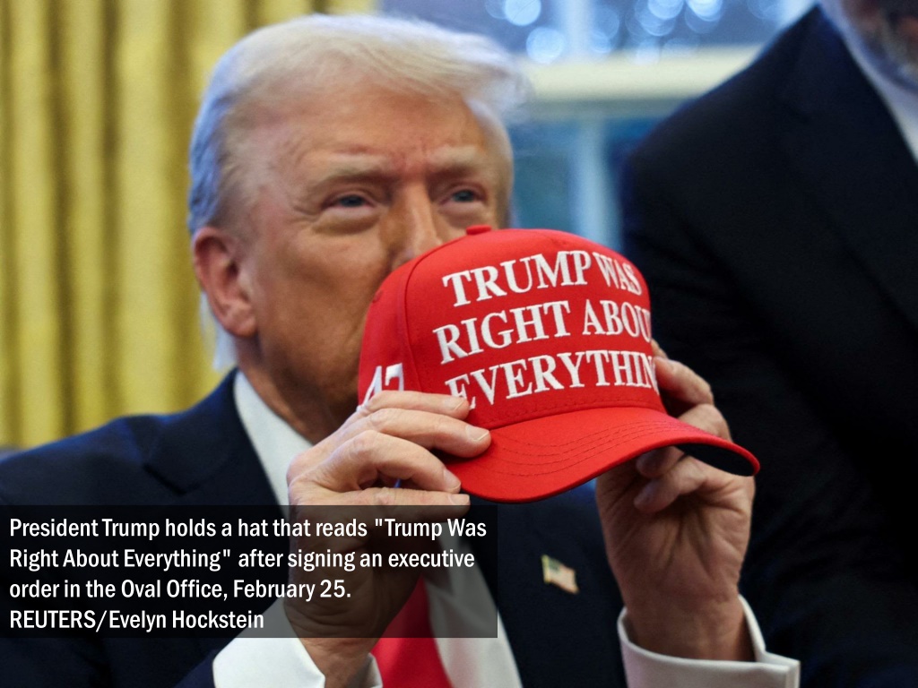President Trump holds a hat that reads "Trump Was Right About Everything" after signing an executive order in the Oval Office, February 25. REUTERS/Evelyn Hockstein