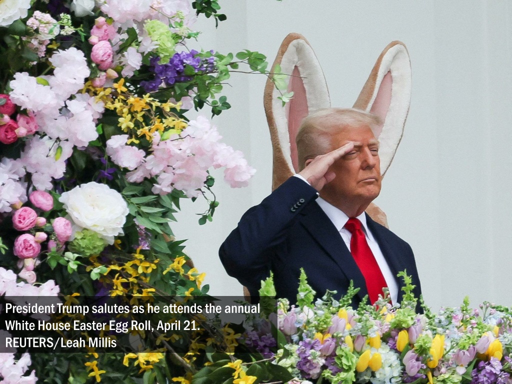 President Trump salutes as he attends the annual White House Easter Egg Roll, April 21. REUTERS/Leah Millis